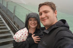 Nach dem Essen machte ich mir das Tragetuch ran und setzte Ella rein. Da es regnete zogen wir uns Tims zweite Regenjacke an und Ella bekam ihren Regenhut auf. Dann ging es los. Wir begannen die 936 Stufen nach oben zu gehen. An den Stufen wurden die 100er-Schritte markiert. Durch das zusätzliche Gewicht von Ella war es ganz schön anstrengend und nach trotzdem schon über 200 Stufen brauchte ich eine Pause. Uns fehlten noch einige Stufen und Ella saß nicht richtig in der Trage. Während des Laufens wurde diese ein bisschen lockerer und ich wurde unruhig. Tim schlug vor, wieder nach unten zu gehen. Das taten wir.