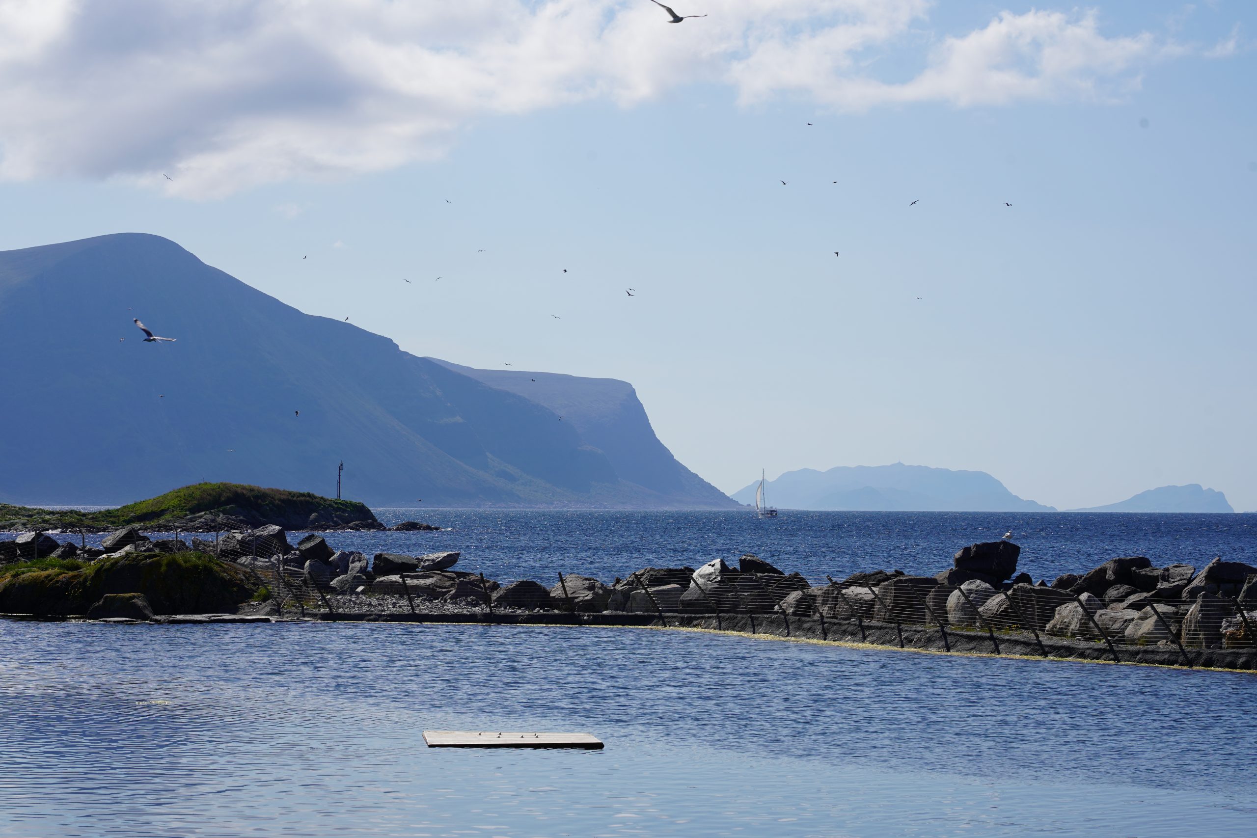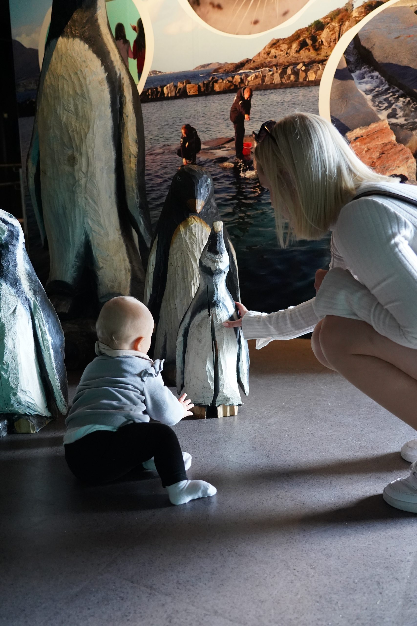 Als auch wir mit dem Mittagessen durch waren, gingen wir weiter in den Außenbereich. Dieser war wunderschön angelegt, mit dem Fjord nur durch eine Steinmauer getrennt. Im Hintergrund die Berge. Dort fand gerade die Fütterung der Pinguine statt. Wie man sich vorstellen kann, sammelten sich da auch wieder die ganzen Leute. Wir nutzen die Gelegenheit und schauten uns ganz in Ruhe und fast alleine die Robben an. Neben dem Robbenbecken gab es ein Becken für die Otter, diese hielten aber sicherlich gerade Mittagsschlaf, da wir keine endeckten.