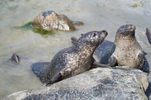 Nach der Fütterung der Pinguine, waren die Robben an der Reihe. Die Robben konnte man von allen Seiten des Beckens beobachten und hatte somit von überall eine gute Sicht auf die Fütterung. Wir schauten eine ganze Weile dabei zu. Ich finde diese Tiere total spannend und total niedlich und lustig, wie sie sich an Land fortbewegen. Im Gegensatz zu der eleganten Art und Weise wie sie sich durch das Wasser bewegen, bewegen sie sich an Land eher unbeholfen und tollpatschig.