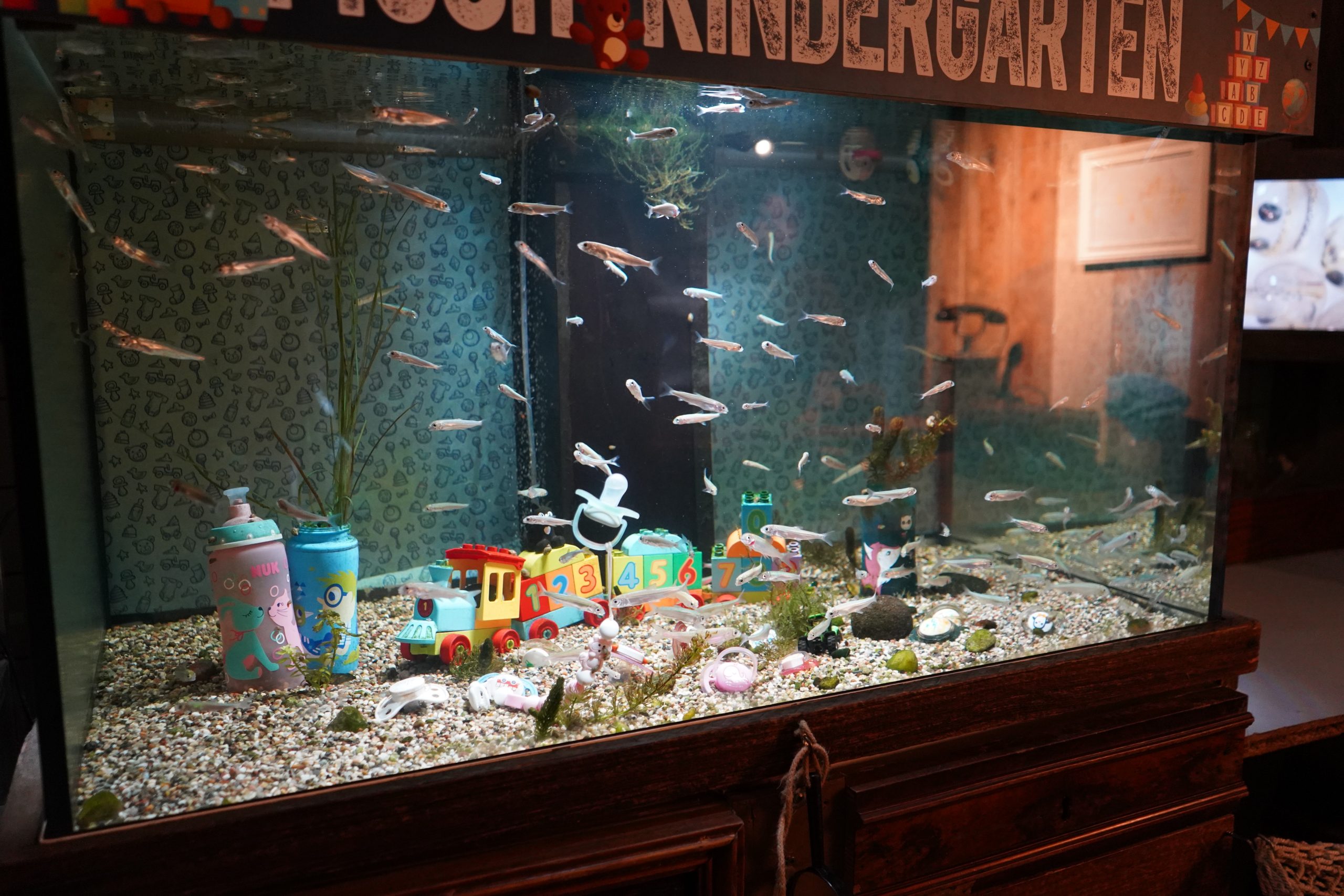 Im Anschluss an unser Mittagessen gingen wir zum Aquarium und schauten uns dort alles an. Immer noch total cool anzuschauen, welche alltäglichen Gegenstände für die Aquarien benutzt werden. So wurde ein Kühlschrank und ein alter Röhrenfernseher umgestaltet und spannend hergerichtet. Bei einem Becken mit Karpfen konnte man die Fische berühren.