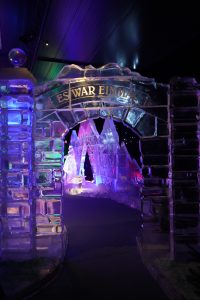 Nach der Angsthasen Scheune ging es in die Kälte. Für die Eiswelten zogen wir uns wieder hübsche blaue Umhänge über. Schon das letzte Mal stellten wir fest, dass diese echt hilfreich sind.