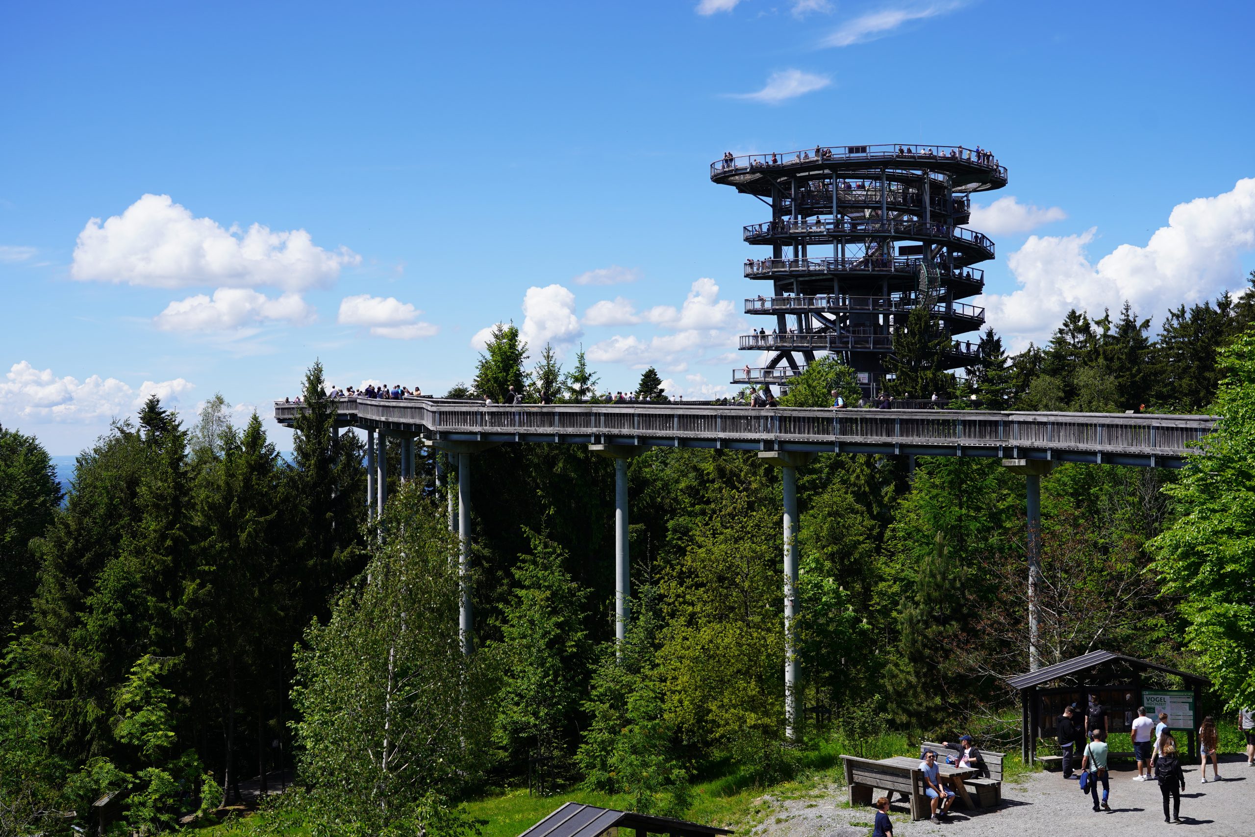 Für heute stand der Wald-Wipfel-Weg in St. Engelmar an. Nach der zwanzigminütigen Fahrt kamen wir auf dem Parkplatz an. Auch heute war der Parkplatz ziemlich gut gefüllt. Als Ella im Kinderwagen saß ging es los.