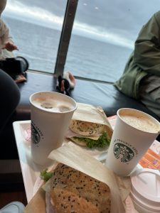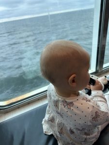 Auf der Fähre geparkt verließen wir das Auto und gingen hoch aufs Deck. Dort fanden wir einen schönen Platz am Fenster.