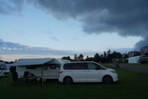 Schnell wurden wir fündig und so steuerten wir einen Campingplatz in Zentrumsnähe an. Man konnte zwar zum Großteil nur positive Bewertungen lesen, allerdings berichteten auch einige, dass es an ein Festivalcamping erinnerte. Und dem konnten wir nur zustimmen. Wir fanden eine große Wiese vor und verteilt darauf stand immer mal wieder ein Anschluss für den Strom. Die Sanitäranlagen waren Container. Aber es war sehr sauber und gepflegt und das Personal sehr nett. Wir durften uns unseren Stellplatz selbst aussuchen, was uns kurzerhand etwas überforderte, da der gesamte Platz frei war und wir zu viel Auswahl hatten.