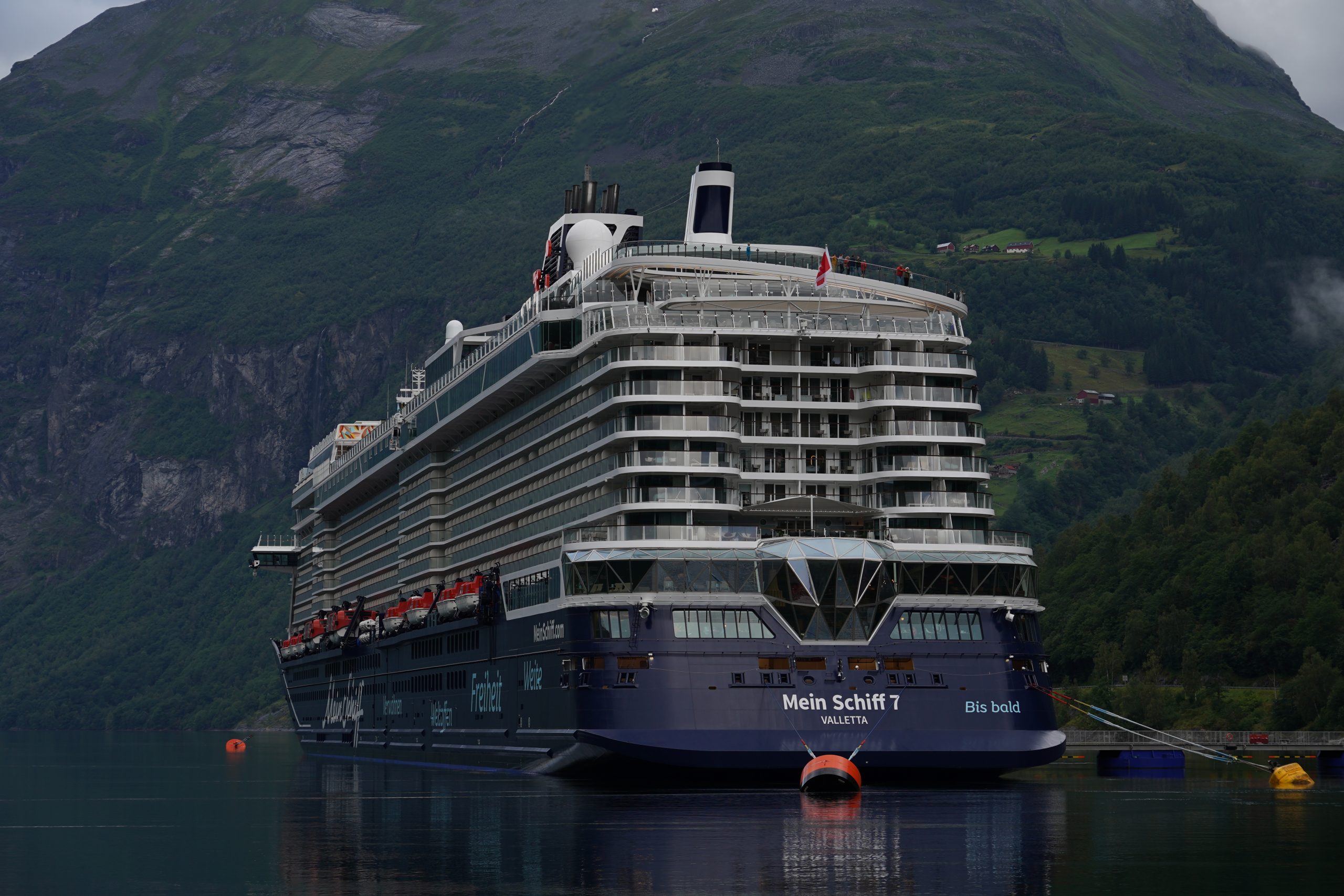Um acht sollte die „Mein Schiff 7“ in den Geirangerfjord einlaufen. Das wollten wir uns anschauen. Viertel acht sagte Tim zu mir, ich solle mich beeilen, er denkt es wäre so weit. Also zogen wir uns an und gingen raus. Ella schlief noch tief und fest.