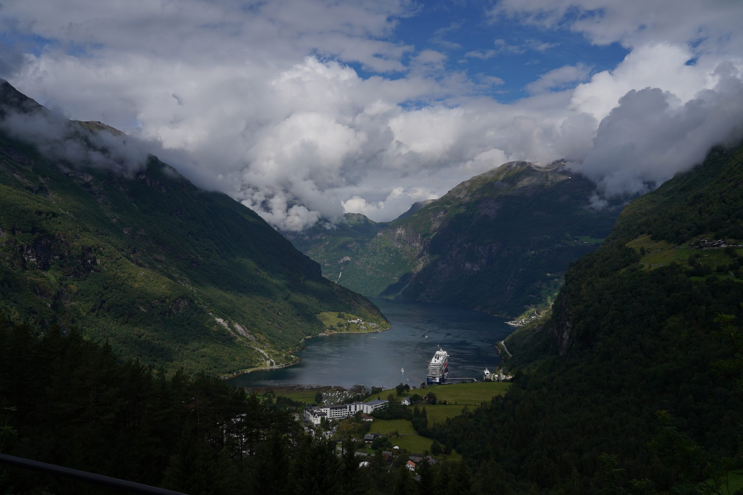 Sehr schade, wir hätten es sehr gern gesehen, aber ändern konnten wir es nun eh nicht mehr. Beeindruckend fanden wir das 3.000 Passagiere-Schiff trotzdem inmitten des Fjords. Es wirkte riesig. Das sind wohl die typischen Bilder des Geirangerfjords.