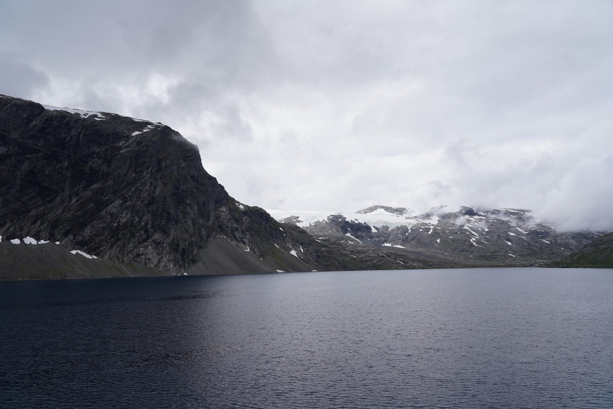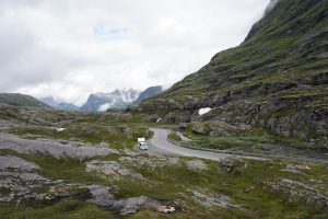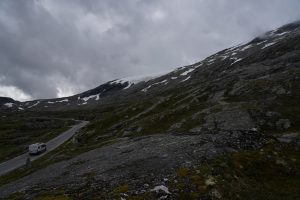 Ungefähr halb 11 verließen wir den Campingplatz in Geiranger und fuhren die ersten Serpentinen hoch. Wir hatten noch wunderschöne Blicke auf die Wasserfälle, den Fjord und das Kreuzfahrtschiff. Natürlich waren wir auch nicht allein unterwegs. Gemeinsam mit uns verließen einige Reisebusse Geiranger – sicherlich alles Tagesausflüge.