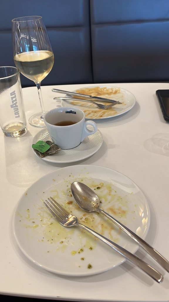 Anschließend gingen wir in die Airport Lounge World und aßen und tranken was. Für Ben gab es Spätzle mit Hähnchen und Pilze (die er natürlich aussortierte) und für mich Nudeln mit Pesto (und den aussortierten Pilzen von Ben). An Getränken hatte man freie Auswahl, über Softdrinks, Kaffee und diversen alkoholischen Getränken war alles dabei, was das Herz begehrt.