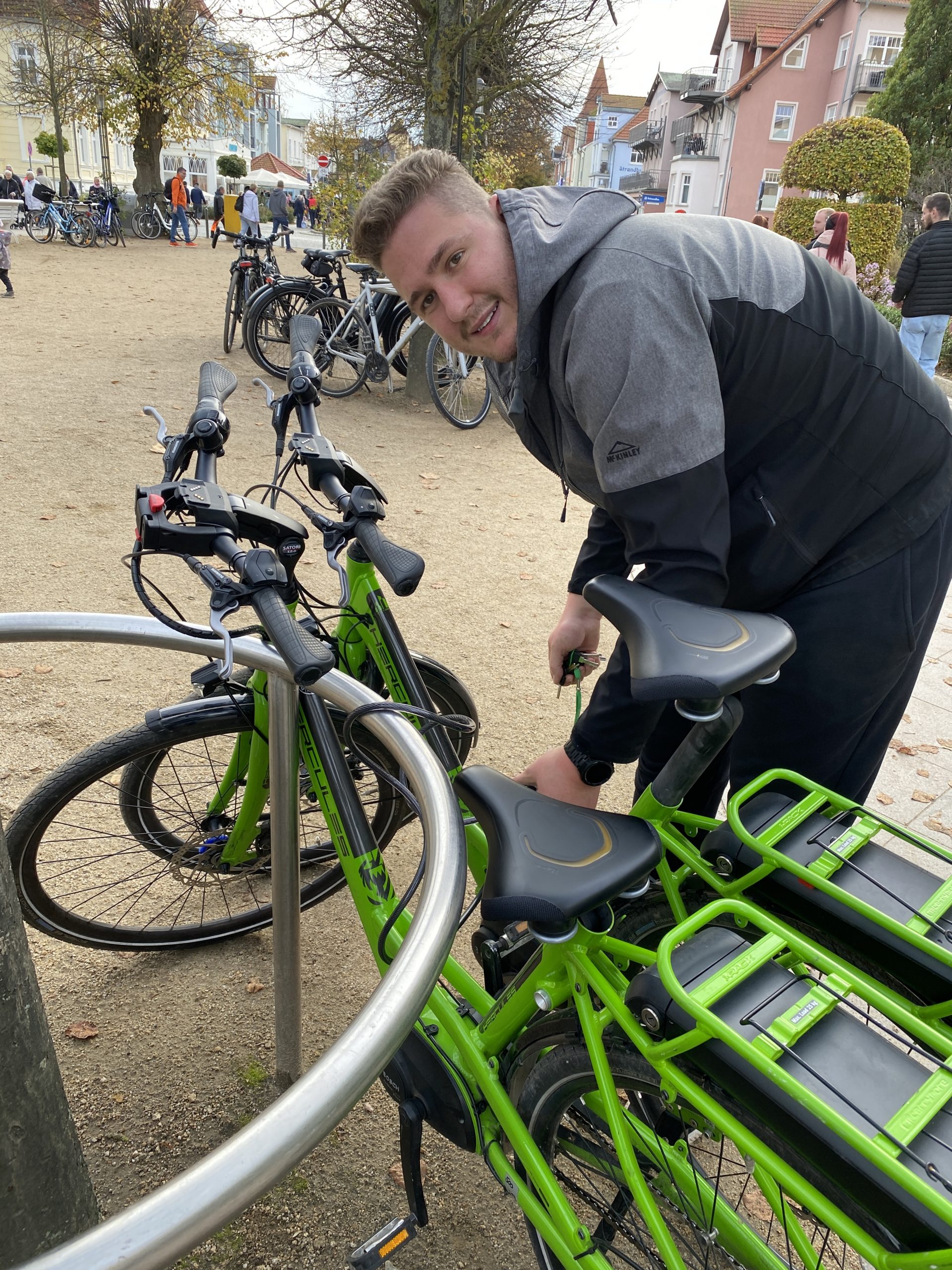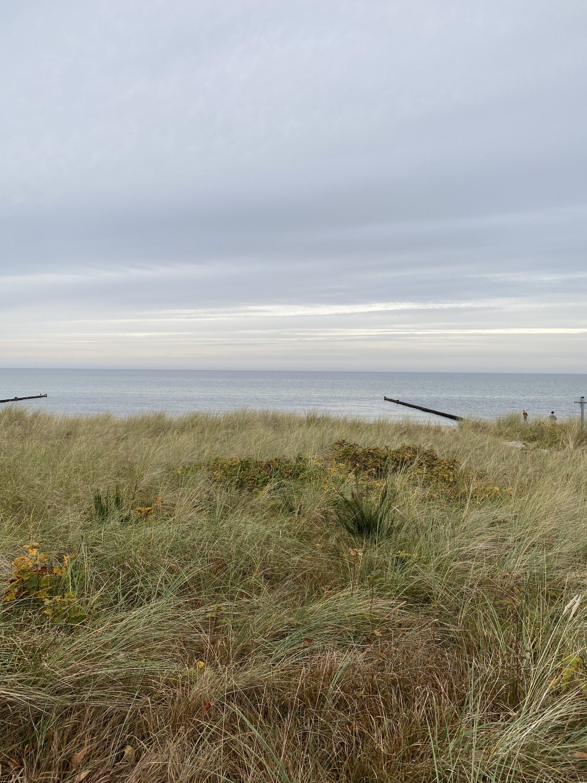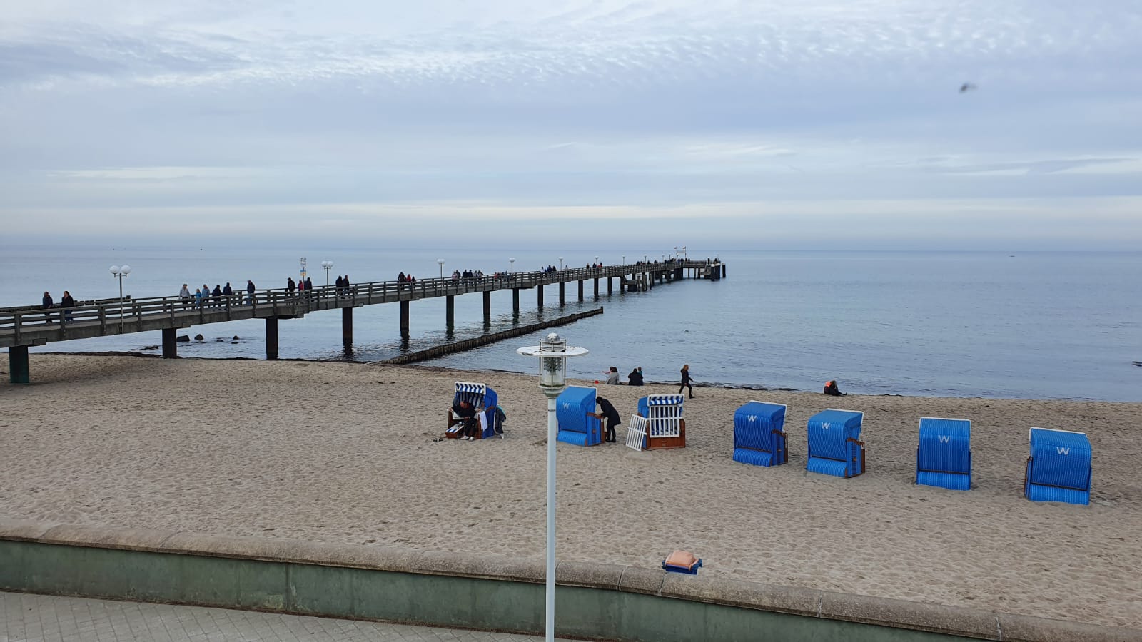 Als wir eingecheckt waren und der Wohnwagen stand, überlegten wir, ob wir direkt etwas kochen wollen oder uns erstmal die Fahrräder schnappen sollen. Wir entschieden uns für zweiteres und radelten los in Richtung Seebrücke. Dort angekommen gab es für mich ein Fischbrötchen und für Tim einen Crêpe.