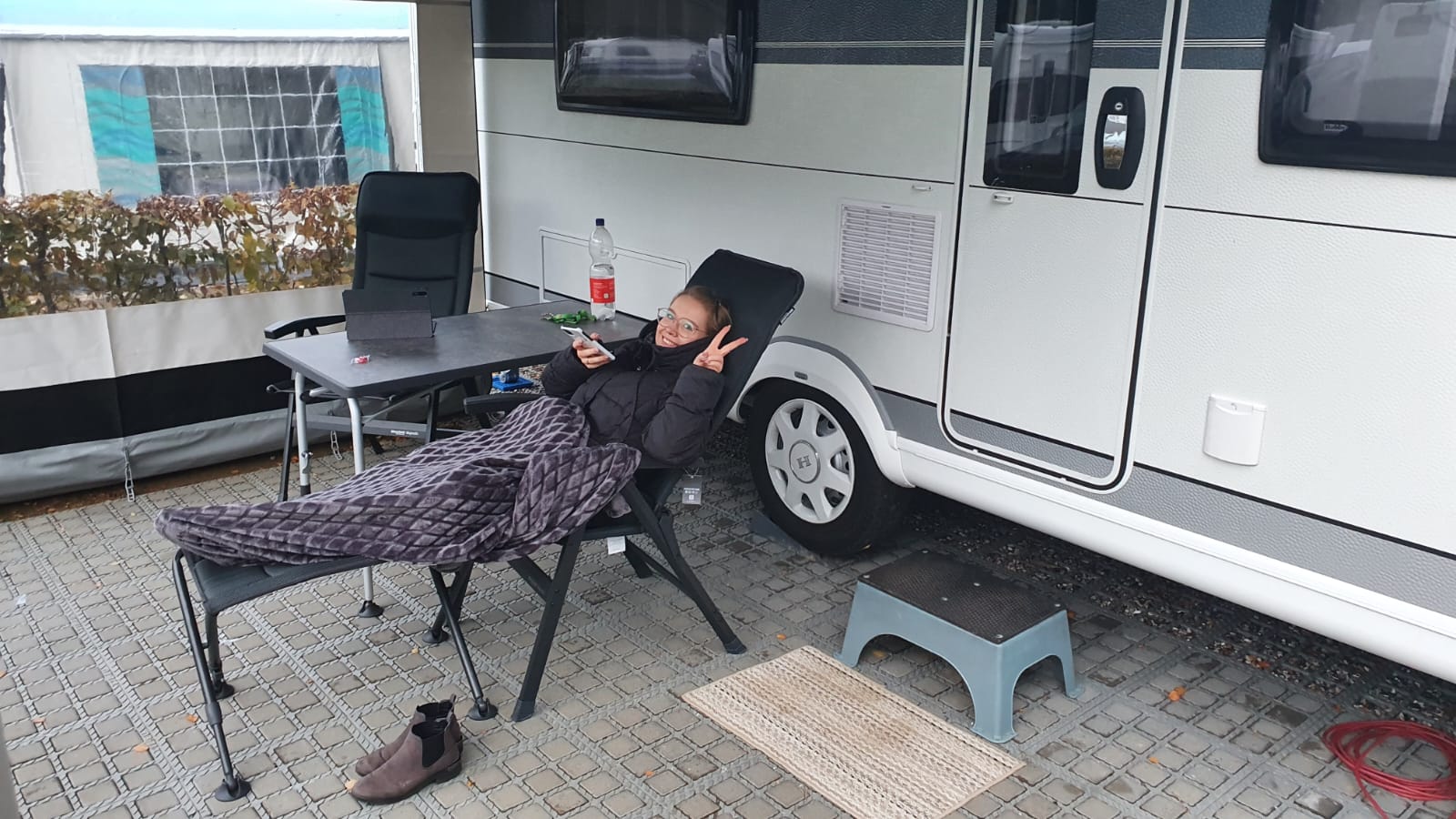 Wieder am Wohnwagen angekommen setzten wir uns noch etwas raus. Mit dicker Jacke, warmen Kuschelsocken und Decke war es total angenehm. Tim reichte natürlich eine einfache Jacke.